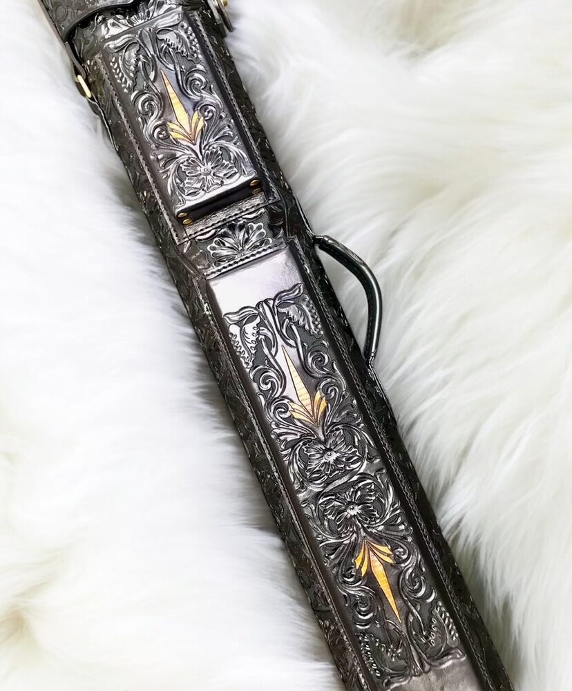 | Description | Full handcarved veg-tan leather cue case stingray filigree. |
