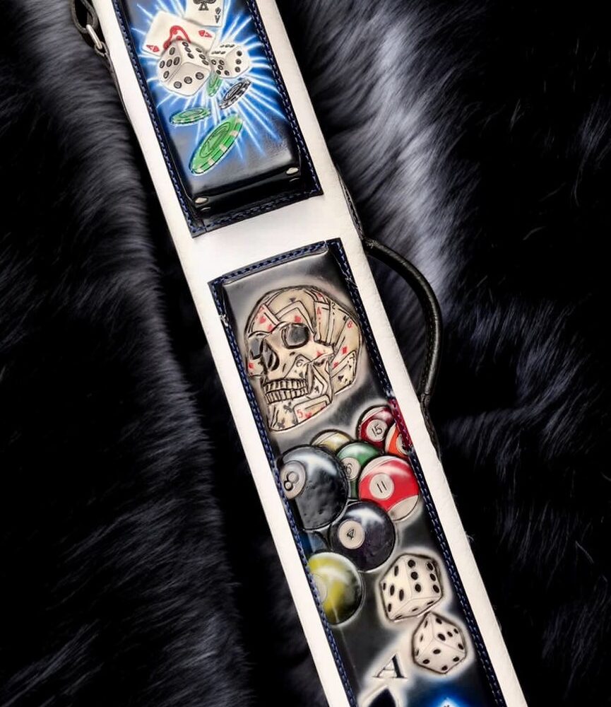 | Description | Custom Gambler theme vegetable leather cue case with genuine crocodile pockets, handle and lid. Stingray accents |