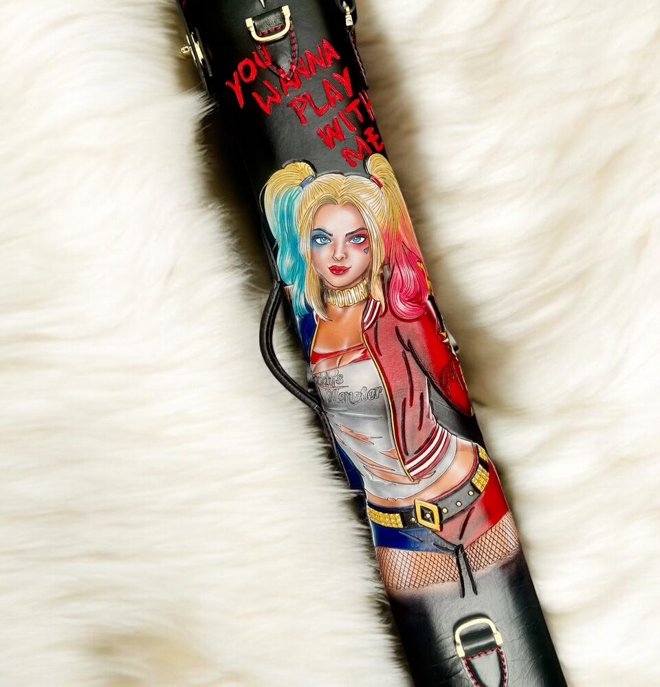 | Description | Custom Harley Quinn theme vegetable tanned leather cue case, with lizard accents |