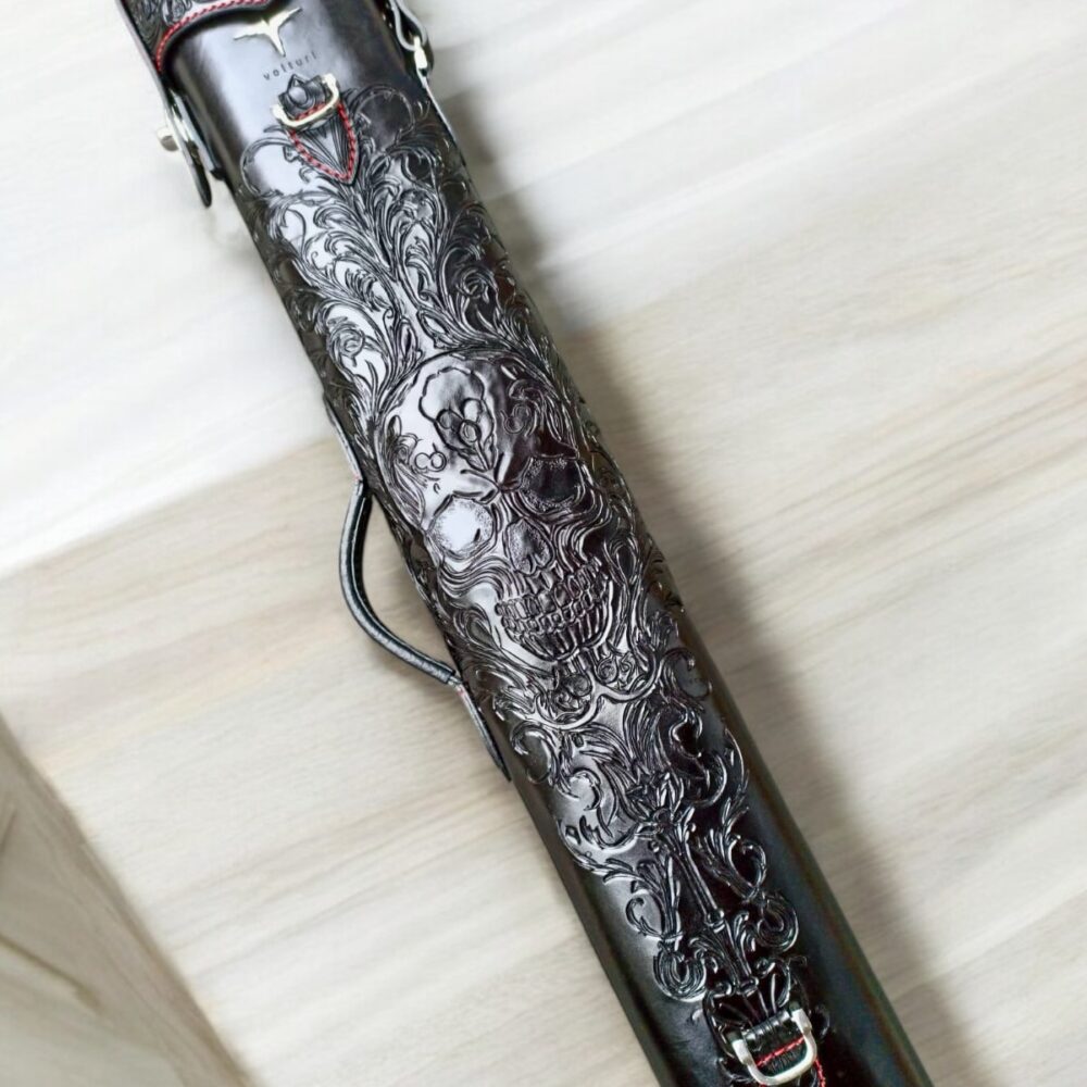 | Description | Custom Gambler theme vegetable leather cue case with genuine crocodile pockets, handle and lid. Stingray accents |